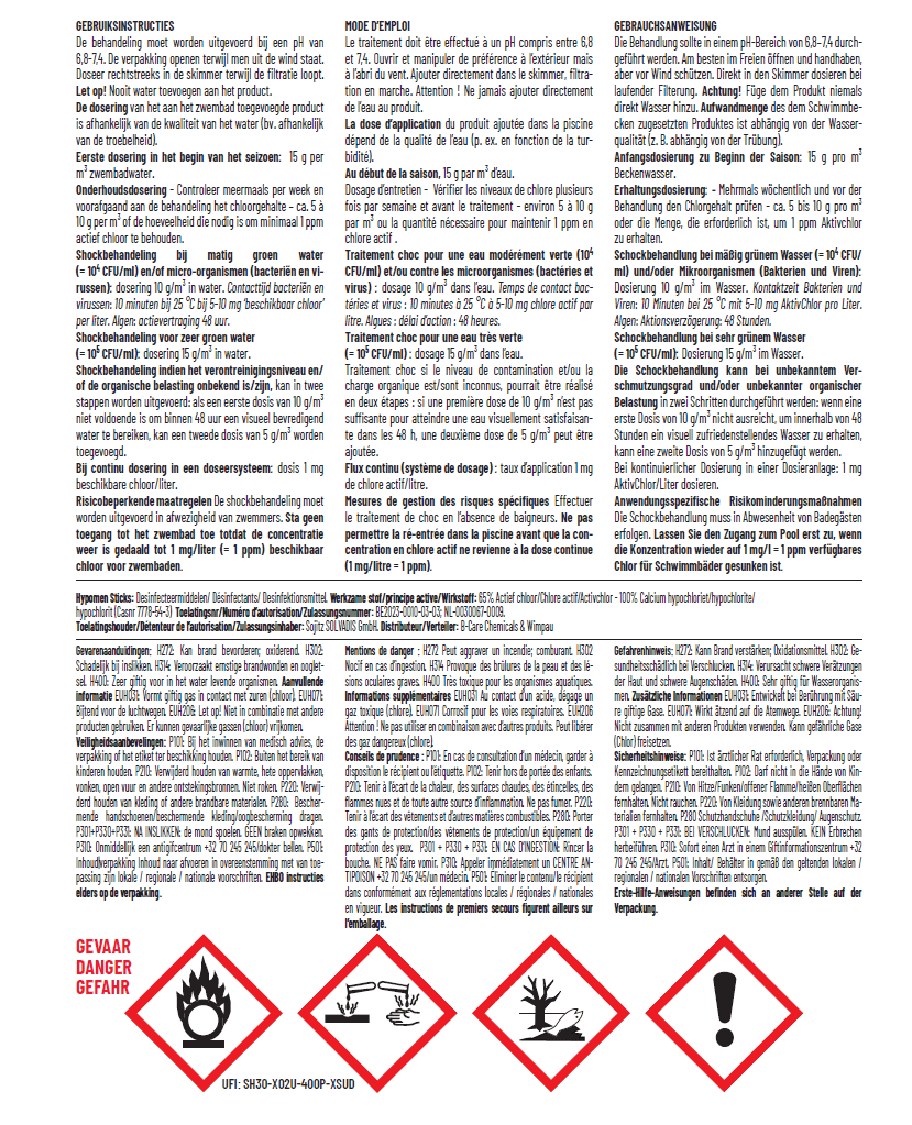 Deze chloorsticks van 300 gram bevatten niet-gestabiliseerde of anorganische chloor. Daarom mag je deze chloor niet gebruiken in combinatie met andere chloorproducten.