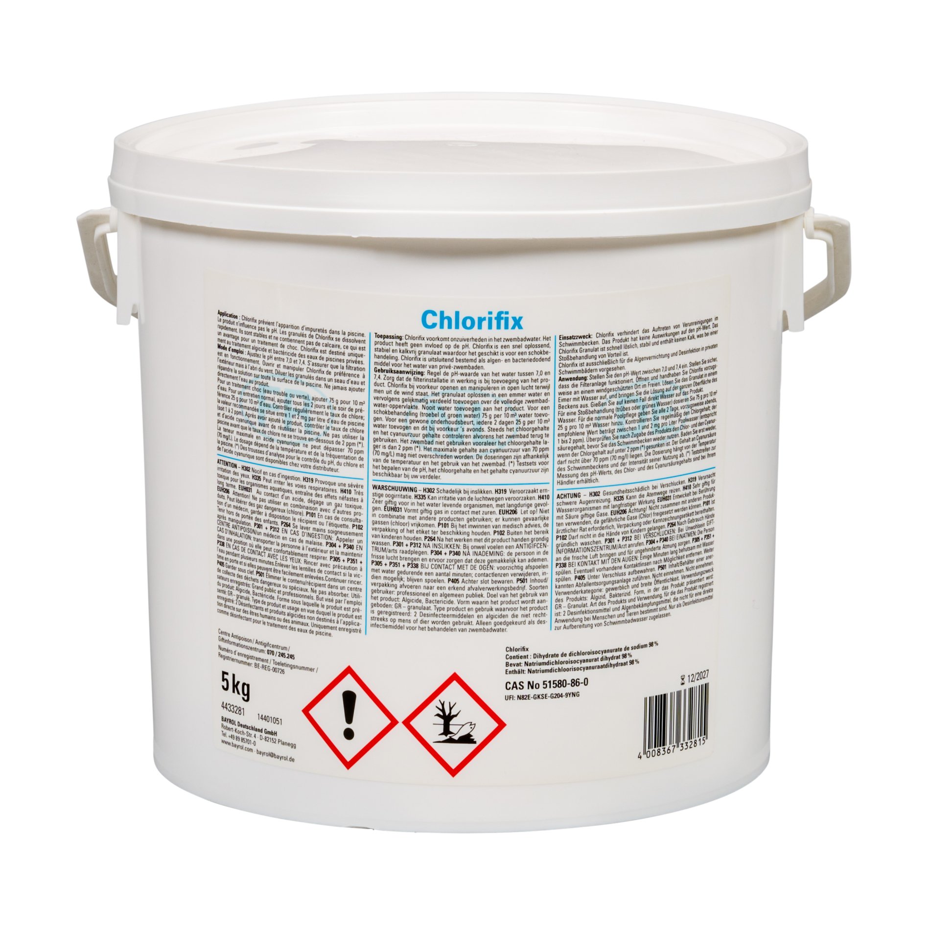 Bayrol Chlorifix Chloor Granulaat 5kg is een krachtige chloorshockbehandeling die snel en effectief de chloorwaarden in zwembadwater verhoogt. Het product is ideaal voor het bestrijden van vervuiling, het herstellen van de waterkwaliteit na zware regenval of bij intensief zwembadgebruik.