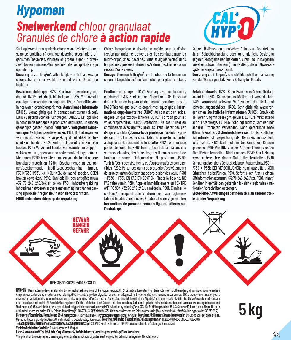 Opgelet: Cal'hypo is een chemisch product, print alvast de technische fiche af voor een veilig gebruik. Lees ook de gebruiksaanwijzing op de verpakking grondig na vooraleer je deze producten gebruikt en bewaar dit product buiten het bereik van kinderen.