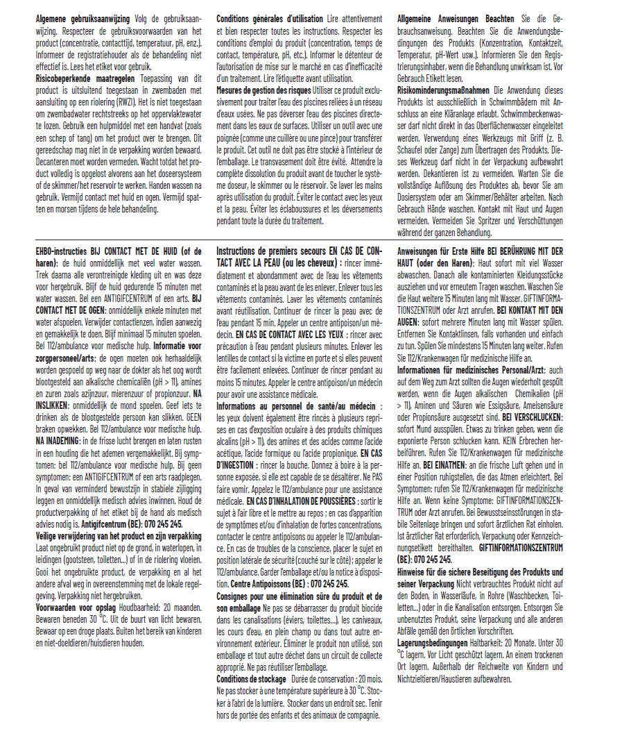 Opgelet: nooit gebruiken in combinatie met andere producten. Kan gevaarlijke (chloor)gassen vrijgeven.