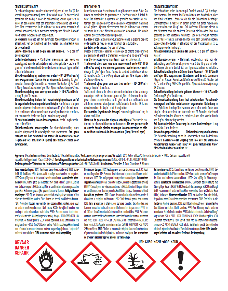 Calciumhypochloriet is een vast chloor dat geen stabilisatoren (zoals isocyanuurzuur) bevat, waardoor overstabilisatie van het water, een veelvoorkomend probleem met andere chloorproducten, wordt voorkomen. Het is zeer effectief in het desinfecteren en elimineren van bacteriën, virussen en algen.