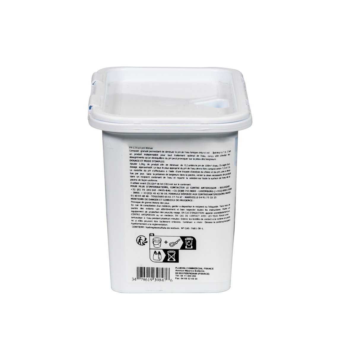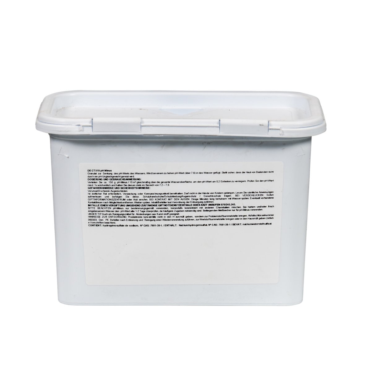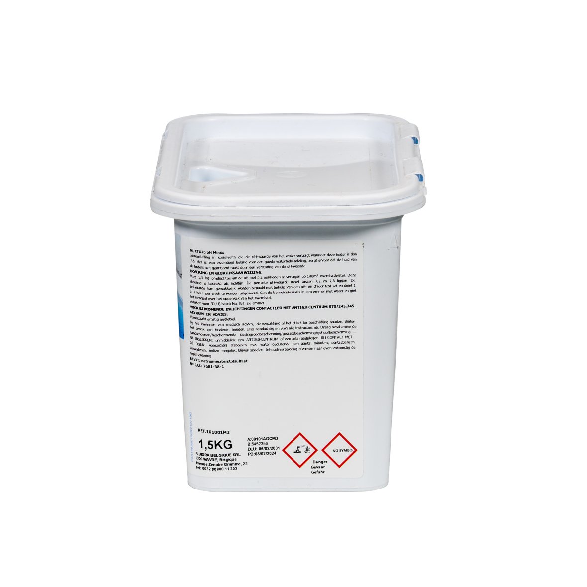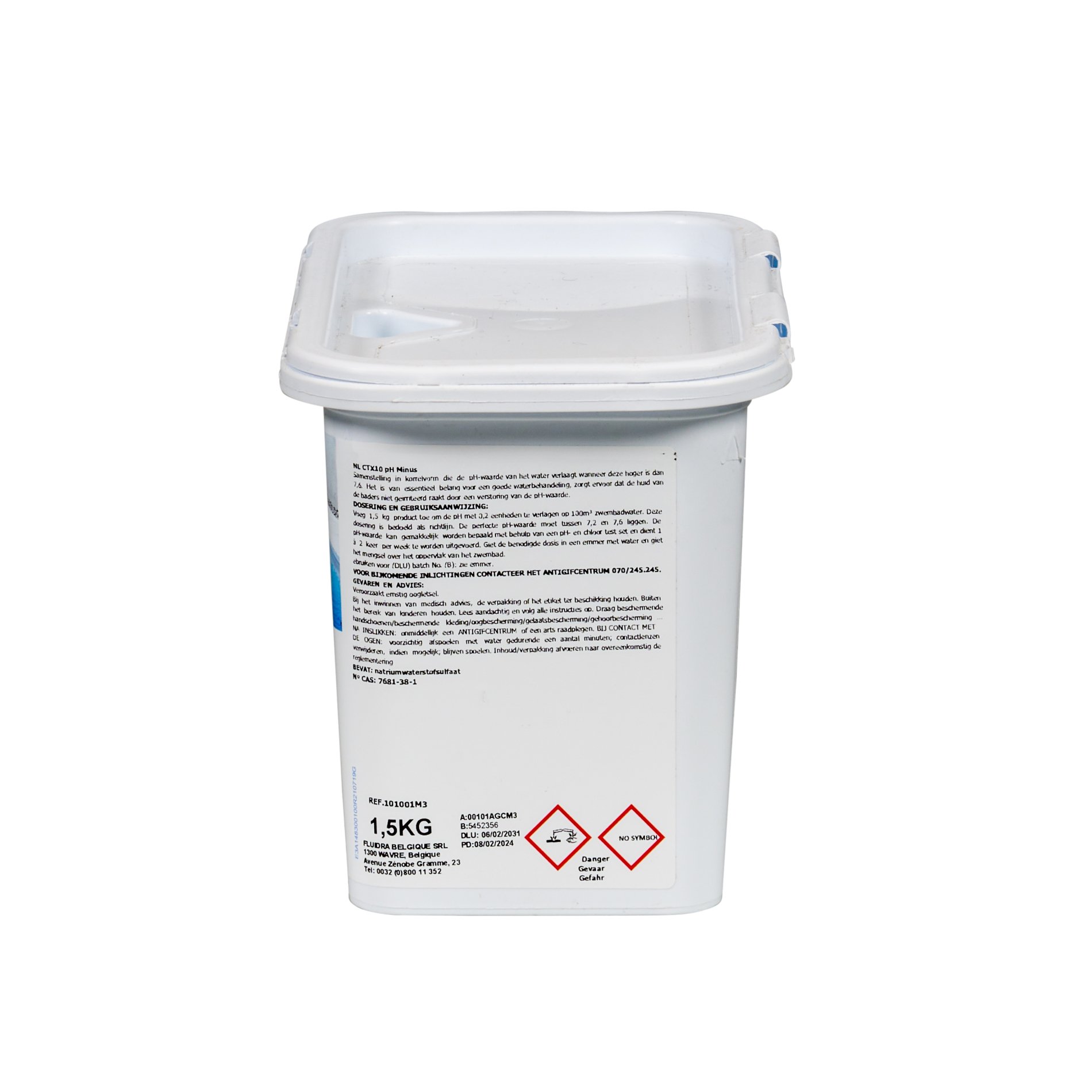 CTX pH Minus 1,5 kg helpt om de pH-waarde van het water te verlagen. Een correcte pH-waarde (tussen 7,2 en 7,6) zorgt voor kristalhelder water, voorkomt irritatie aan huid en ogen, en optimaliseert de werking van andere chemische producten. Dit pH-verlagende poeder is eenvoudig te doseren en lost snel op, waardoor het ideaal is voor regelmatige waterbehandeling en onderhoud van uw zwembad.
